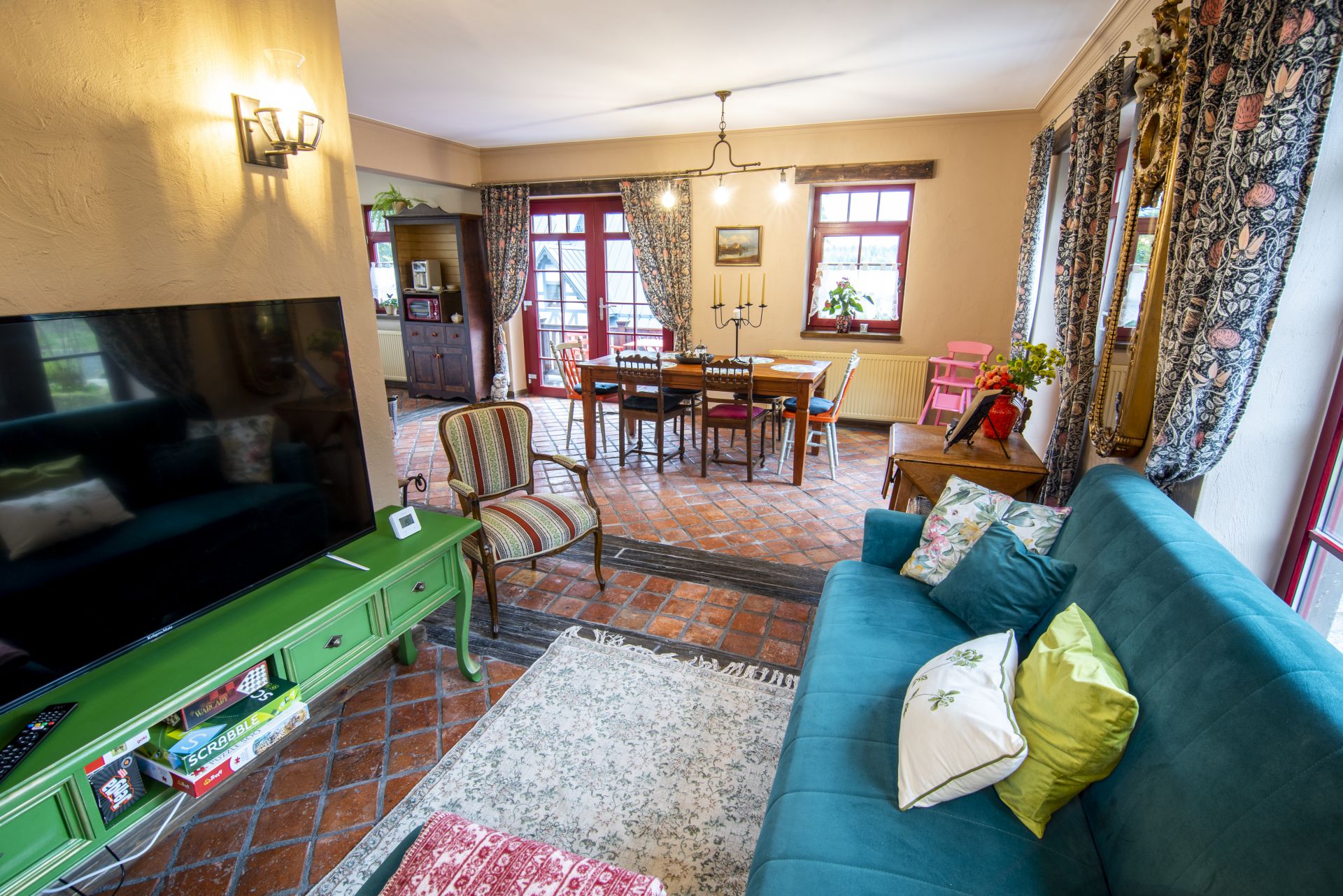 Przestronny salon z sofą, kącikiem telewizyjnym i dużym stołem